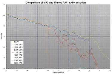The aim here is to choose a compression format with which to encode an entire CD collection for easy access in a media center.I've taken a typical 4 minute song and encoded it using LAME mp3 and iTunes AAC at various bit-rates and then analysed their spectral content and compared them with the raw original.