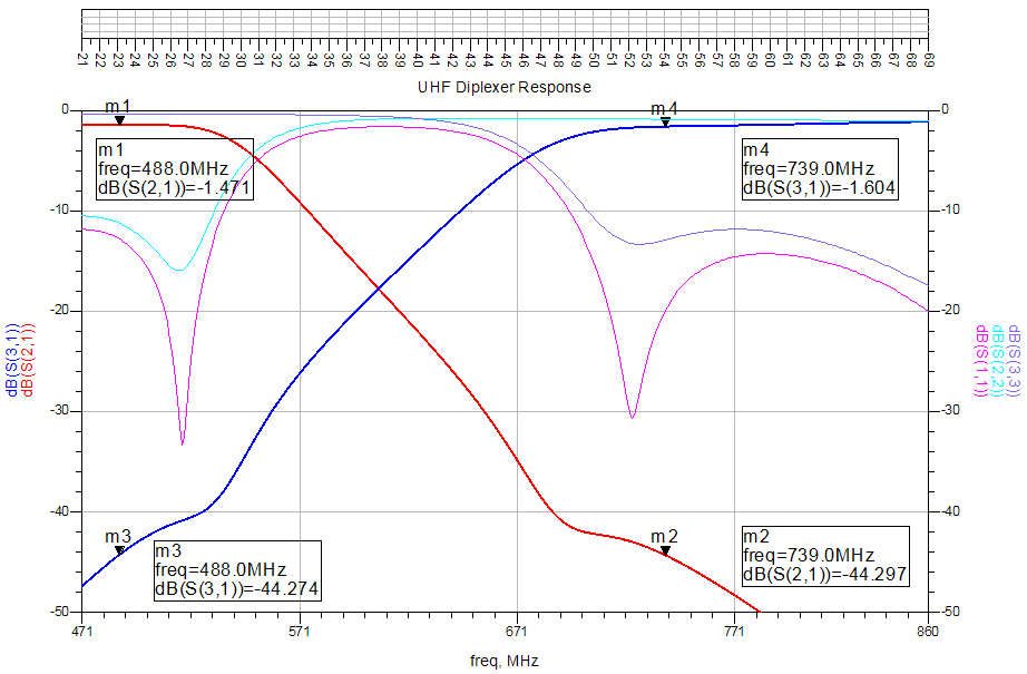 The measured results of the constructed circuit show slight deviation from the simulation, but not enough to warrant re-tuning. All design goals have been met with sufficient margin.The Cable-TV output and DVB multiplex frequencies are shown by the purple vertical lines.