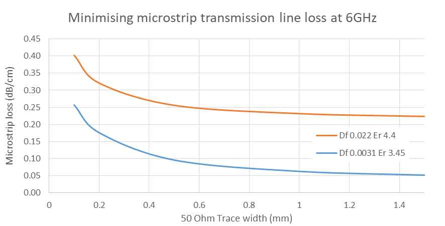 The benefits are significant for both standard FR4 (orange) and a low loss laminate like Rogers RO4350B (blue). These simulations were performed at 6GHz and include both conductor and dielectric losses.